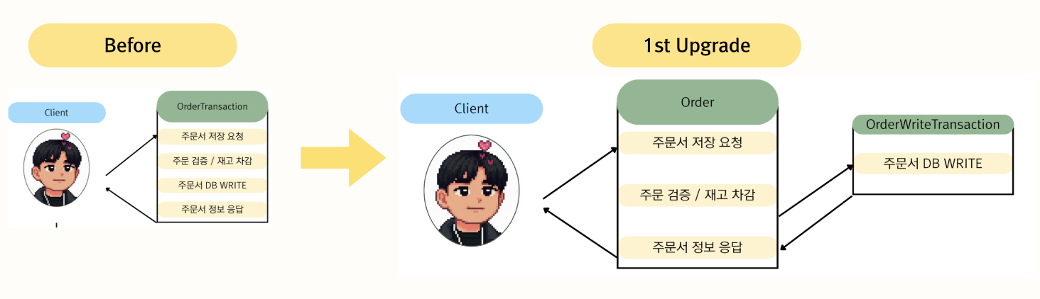 기존 Order 트랜잭션에 포함된 작업을 정리해보면 DB 관점에서는 크게 두 가지 책임이 섞여 있었다.