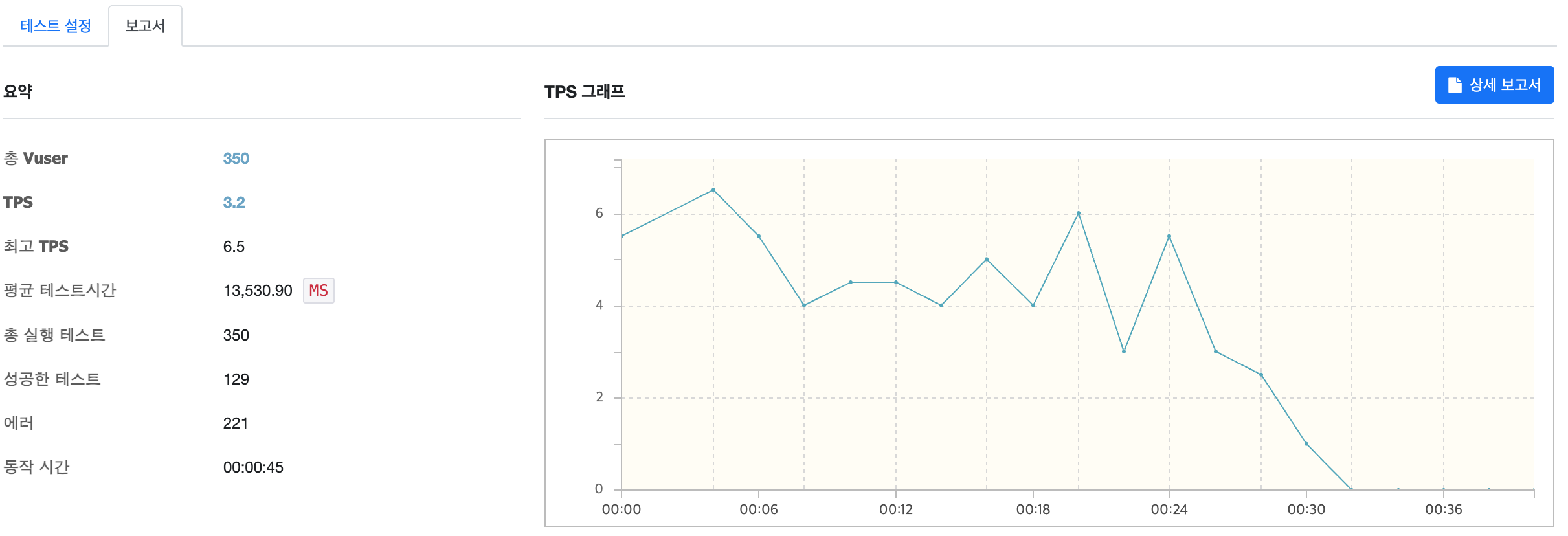 이후 동일 시나리오, VUser 350명으로 테스트를 돌리게 되었을때의 결과는 아래와 같다.