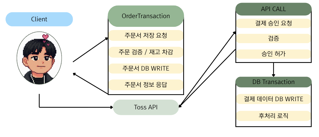 결제는 외부 PG API 호출이 포함되는데 기존처럼 하나의 큰 트랜잭션으로 묶는 구조는 위험하다는 판단이었다.