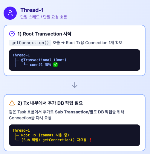 - Thread-1이 Transaction을 시작한다 → Root Transaction용 Connection 1개 획득