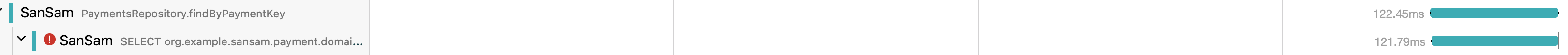 Jaeger Trace를 통해 전체 요청 흐름을 시각화해보니, paymentKey 조회 구간이 상대적으로 가장 긴 지연 구간으로 관측되었다.