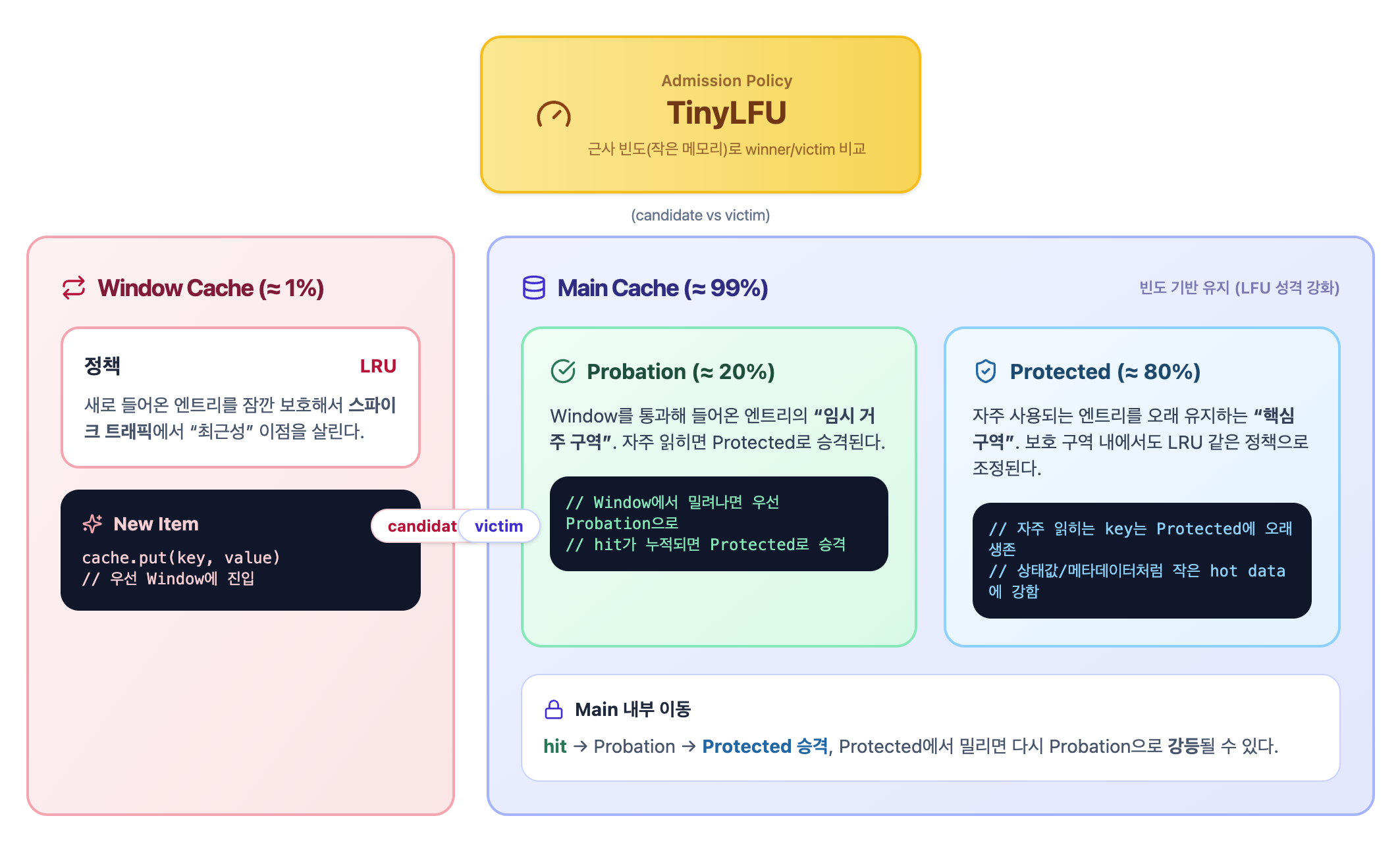 다른 캐시 라이브러리에 비해 낮은 지연시간과 높은 적중률을 동시에 제공하는 것으로도 잘 알려져 있다. 특히, 이번 케이스처럼 읽기 비중이 압도적으로 높은 상태값을 다루는 상황과 잘 맞아 떨어진다고 판단했다.