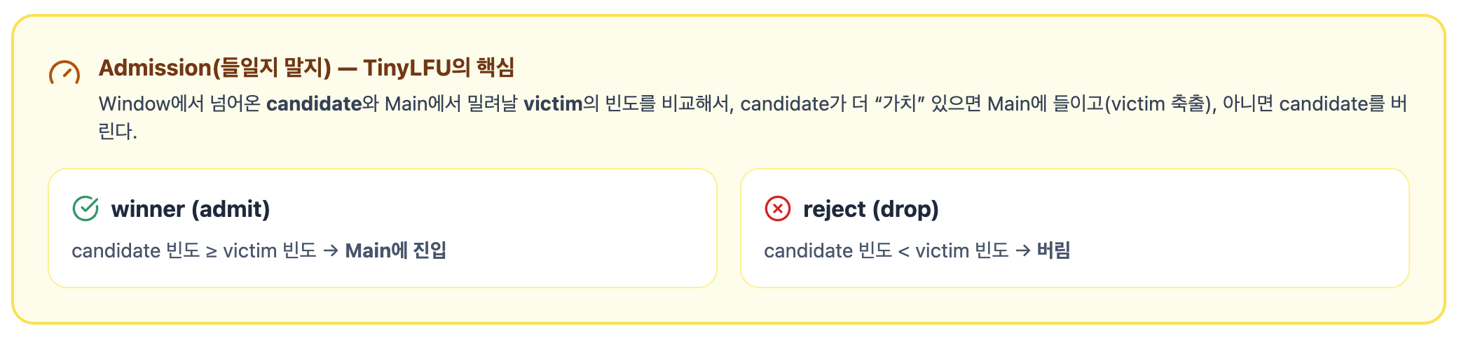 반대로 잠깐 반짝 트래픽인 데이터는 Admission 단계에서 걸러져 캐시 오염을 줄일 수 있다.