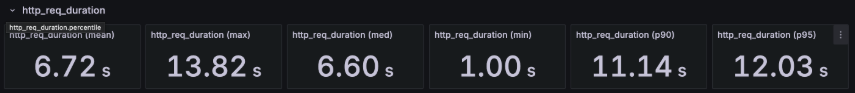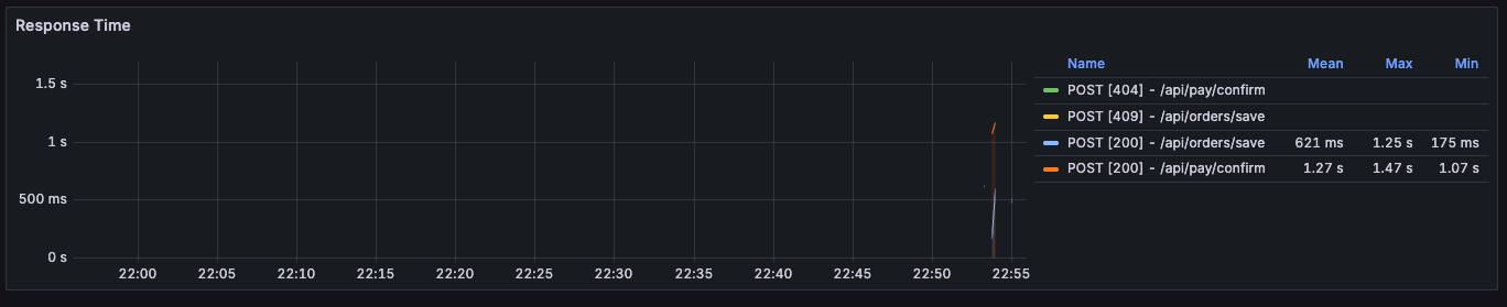 실제 피크테스트 결과를 보면, 주문 API의 Max 응답 시간이 12~13초까지 튀는 구간이 관측되었고,