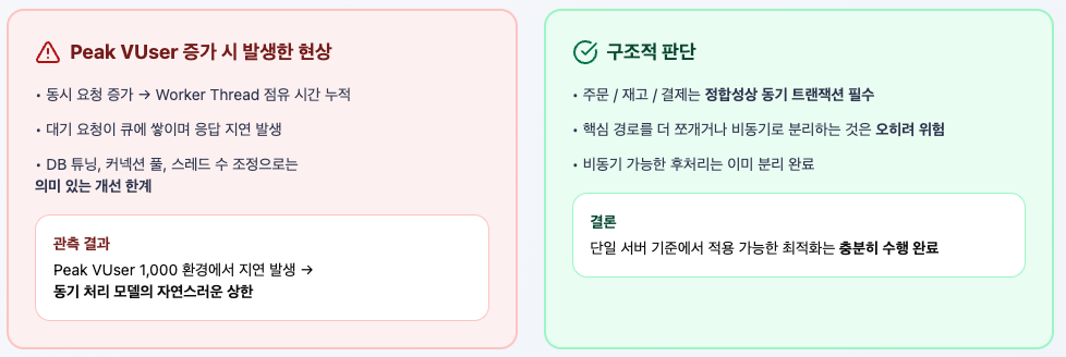 즉, Peak VUser 1,000에서 관측된 지연은 동기 처리 기반 구조가 자연스럽게 도달한 한계에 가깝다.