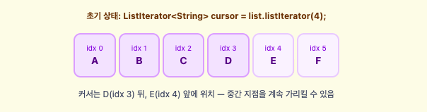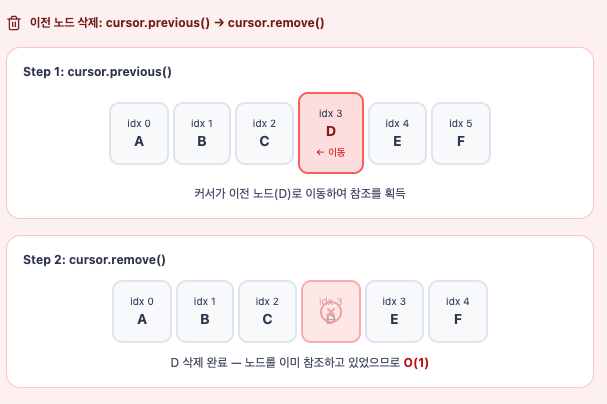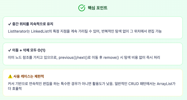 즉, ListIterator로 하여금 중간 위치를 지속적으로 가리킬 수 있게 만들어서 이동 + 삭제까지를 O(1)의 시간복잡도 내에 처리 가능하도록 한다.