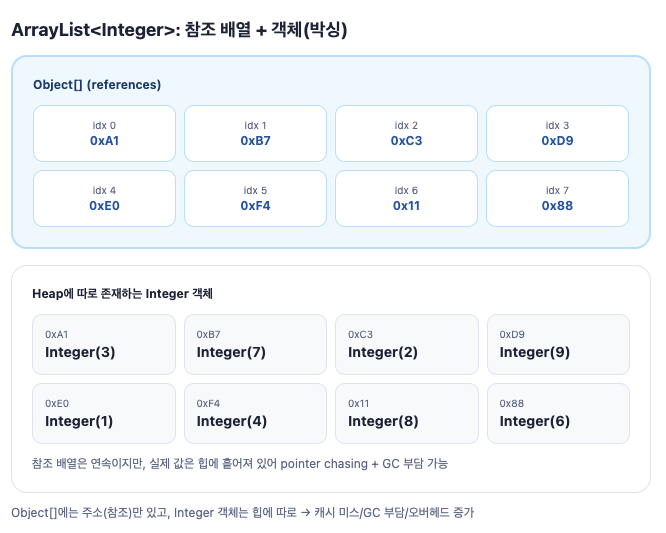 ArrayList<Integer> : Object[] 안에 Integer 객체 참조(주소값)가 저장된다.