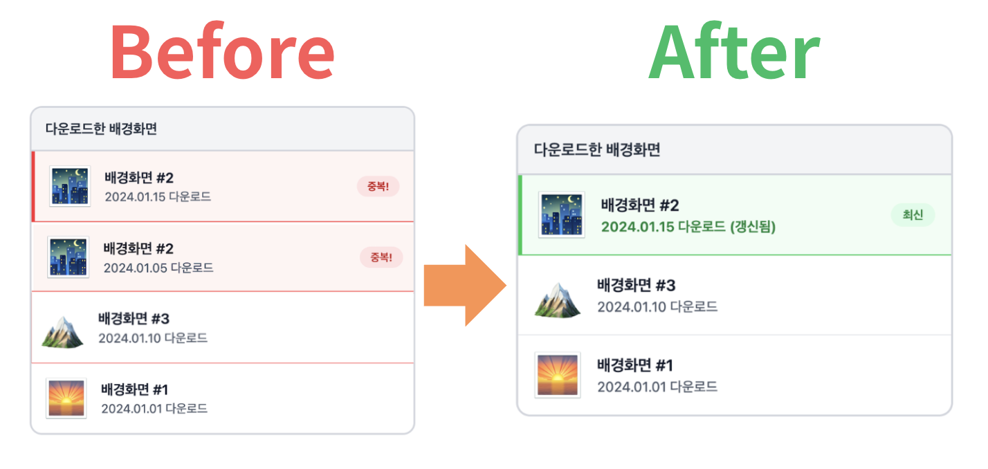 즉, 오늘 2번 배경화면을 다운로드하고 내일 다시 2번 배경화면을 다운로드하더라도 "다운로드한 배경화면 보기" 화면에서는 2번 배경화면이 연속해서 노출되어서는 안된다는 것이다. 다시 말해, 사용자가 동일한 배경화면을 다시 다운로드한 경우에는 다운로드 일자와 같은 메타 정보만 갱신하고, 목록 상에서는 이전 항목을 덮어쓰는 형태로 보여주길 원한 것이다.