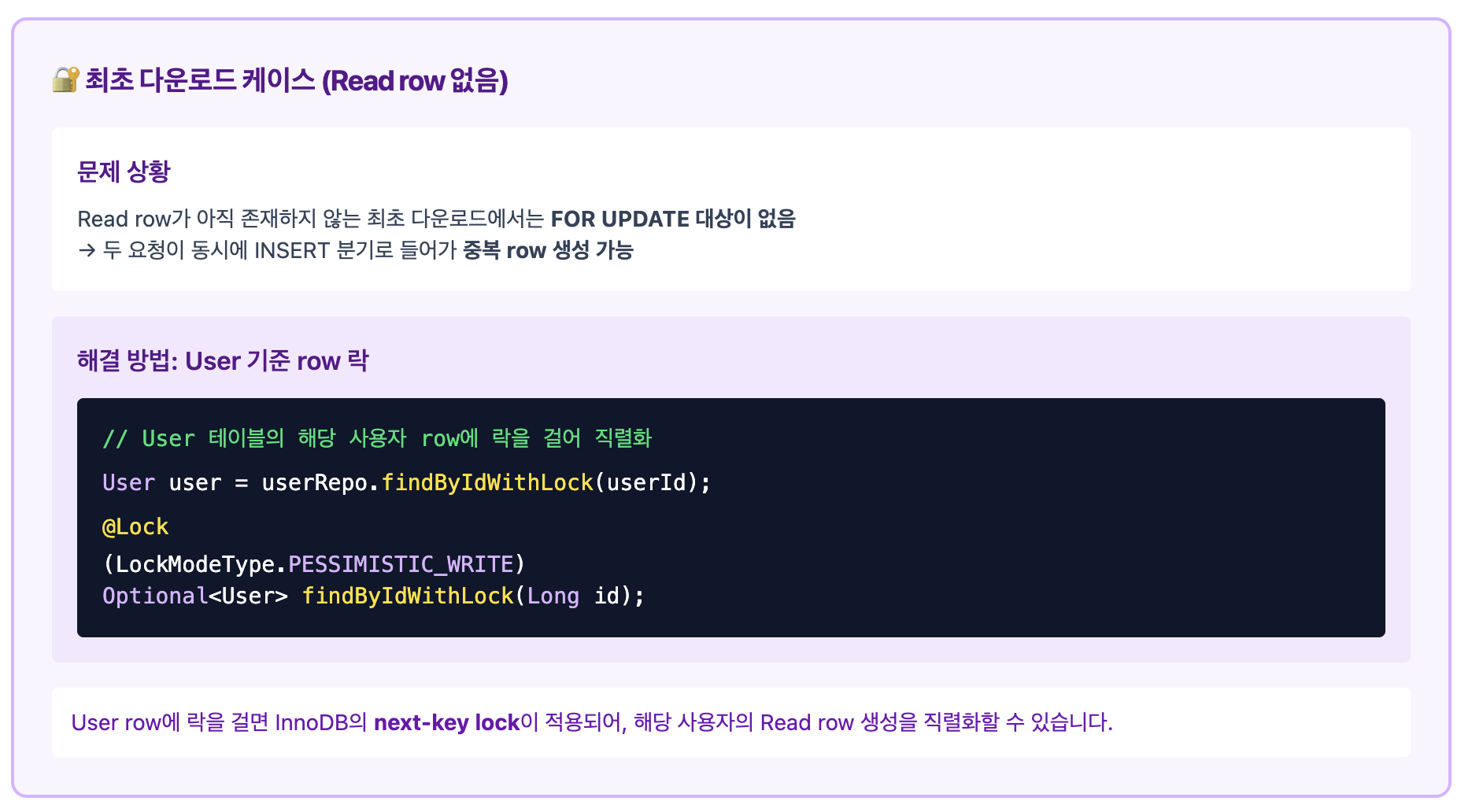 또한, Read row가 아직 존재하지 않는 최초 다운로드 케이스에서는 별도의 user row락을 사용해 Read row가 중복 생성될 수 있는 상황까지 차단했다. 아래에서 더 자세하게 설명하겠다.