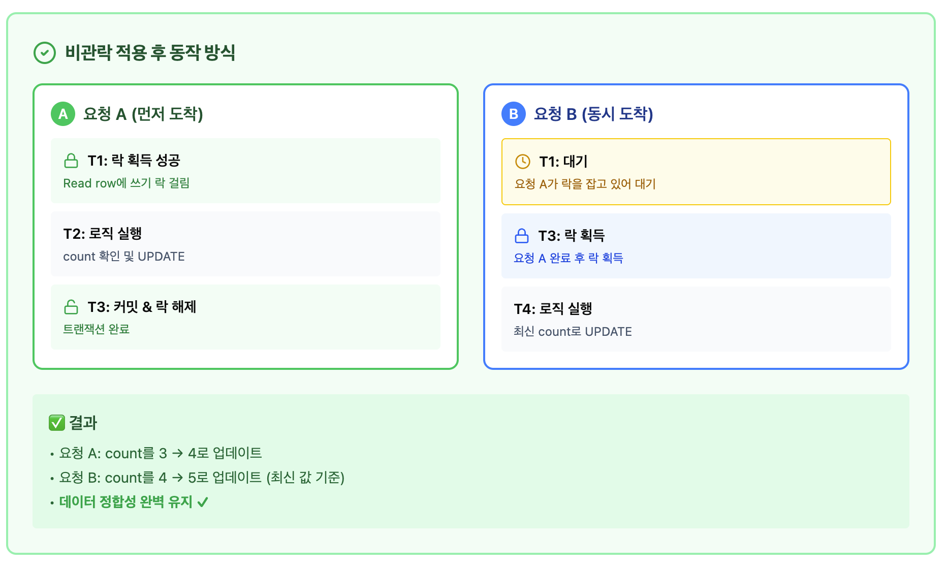 여기서 사용한 비관락은 MySQL (InnoDB)의 SELECT..FOR UPDATE를 이용한 row-level pessimistic lock이다.