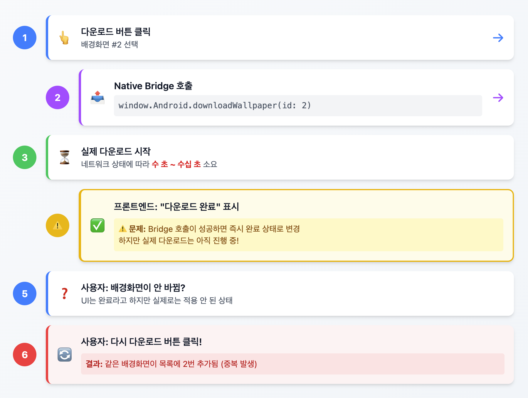 하지만 이 서비스는 자동차 웹앱이라는 특수한 환경 위에서 동작하고 있었다. 자동차 환경 특성상, 네트워크 상태가 항상 안정적일 수는 없었다. 문제는 바로 이 지점에서 발생했다. 사용자가 다운로드 버튼을 누르면 프론트엔드에서는 요청이 정상적으로 전달되었다고 판단해 곧바로 "다운로드 완료" 상태를 표시한다. 그러나 실제로는, 안드로이드 앱 단에서 배경화면을 내려받아 적용하는 과정이 네트워크 상태에 따라 상당한 시간이 걸릴 수 있었다. 현재 프론트엔드에서는 연속적으로 발생하는 중복 요청에 대해서는 일정 시간 간격을 두고 재요청을 막고 있었다. 하지만 문제는 연속적이지 않은 상황이었다.