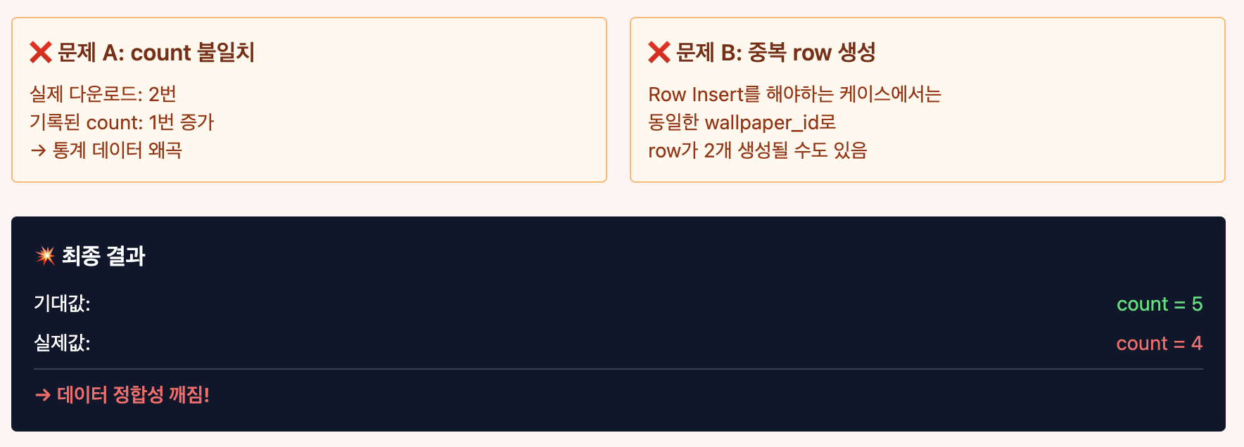 사건의 발단은 이러했다. 원래 기획 의도대로라면 사용자가 동일한 배경화면을 연속으로 두 번 다운로드하더라도 그 요청은 그대로 처리되어야 했다. 이미 다운로드가 되어 있는 배경화면이더라도 사용자는 다시 한 번 다운로드하고 싶을 수 있고, 그 선택 자체를 제한할 이유는 없었기 때문이다. 이는 우리가 컴퓨터에서 사진을 다운로드할 때와도 같은 원리였다. 같은 파일을 두 번 다운로드한다고 해서 두 번째 다운로드가 막히지는 않는다.