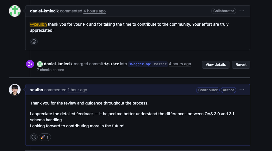 하지만 직접 해보니, 가장 중요한 것은 기존 레거시 코드를 이해하려는 태도와 왜 이렇게 동작하는 것인지를 끝까지 파고드는 끈기였던 것 같습니다. 특히 실무에서도 사용하는 Swagger에 직접 기여하게 되어 더욱 뜻깊었습니다.